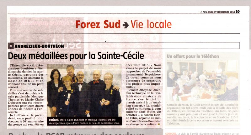 Pour fêter la Sainte-Cécile, nous avons animé la messe dominicale du 23 novembre 2014 en l’Eglise d’Andrézieux Bourg et donné un mini concert devant une assistance nombreuse. De plus, cette animation ajoutait une certaine solennité à une cérémonie religieuse particulière.